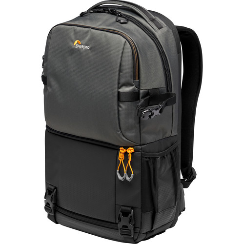 The gray Fastpack BP 250 AW III from Lowepro is a versatile backpack that features two main compartments, including a camera compartment along the base of the bag that can be used to hold a small DSLR or mirrorless camera body with three or four lenses, including an attached 24-70mm f/2.8 lens. Positioned so that it can be reached when the bag is rotated from one’s back to front with its left side facing upward, the camera compartment’s zippered, peel-away opening includes an internal clip system that allows the wearer to ensure that the zippered opening provides side access only. Alternatively, the clip system can be released so that the peel-away opening can be fully unzipped and retracted, enabling complete access to the camera compartment such as when the bag is placed on a flat surface with its backpack straps facing downward. Above the camera compartment, a top-facing zippered storage compartment can accommodate packable clothing and features organizer pockets which can be used to store travel documents, camera batteries, memory cards, or small electronics Lowepro